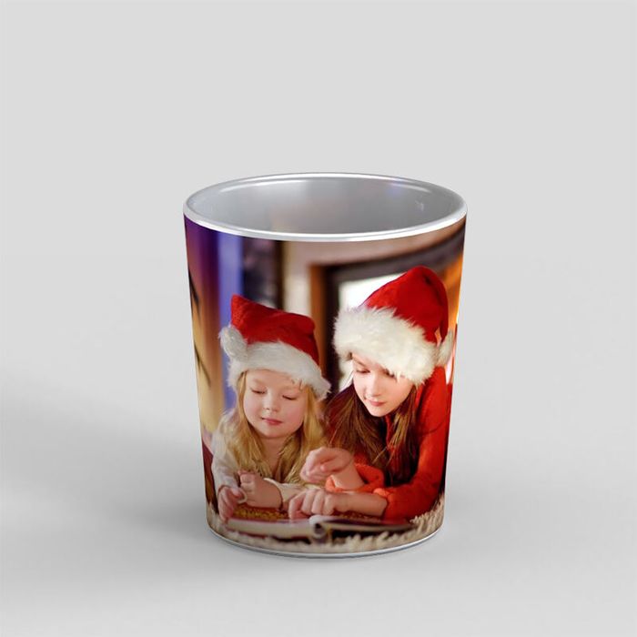 We bedrukken een strook die rondom de kaarsenhouder wordt gewikkeld, daarom adviseren we om een grote foto te gebruiken. Deze kun je in ons ontwerpsysteem verplaatsen, totdat de kenmerken die je graag uit wil lichten zich binnen het afdrukgebied bevinden. Je kunt ook meerdere foto's toevoegen; creëer bijvoorbeeld een fotocollage door kleine afbeeldingen naast elkaar te plaatsen. Een korte lieve boodschap, zoals 'Fijne Kerstmis' of 'Relax', zien er geweldig uit wanneer ze op deze mooie accessoires worden afgedrukt. Voeg de tekst van jouw keuze toe, kies het lettertype en de kleur en verplaatst deze naar de gewenste plek.