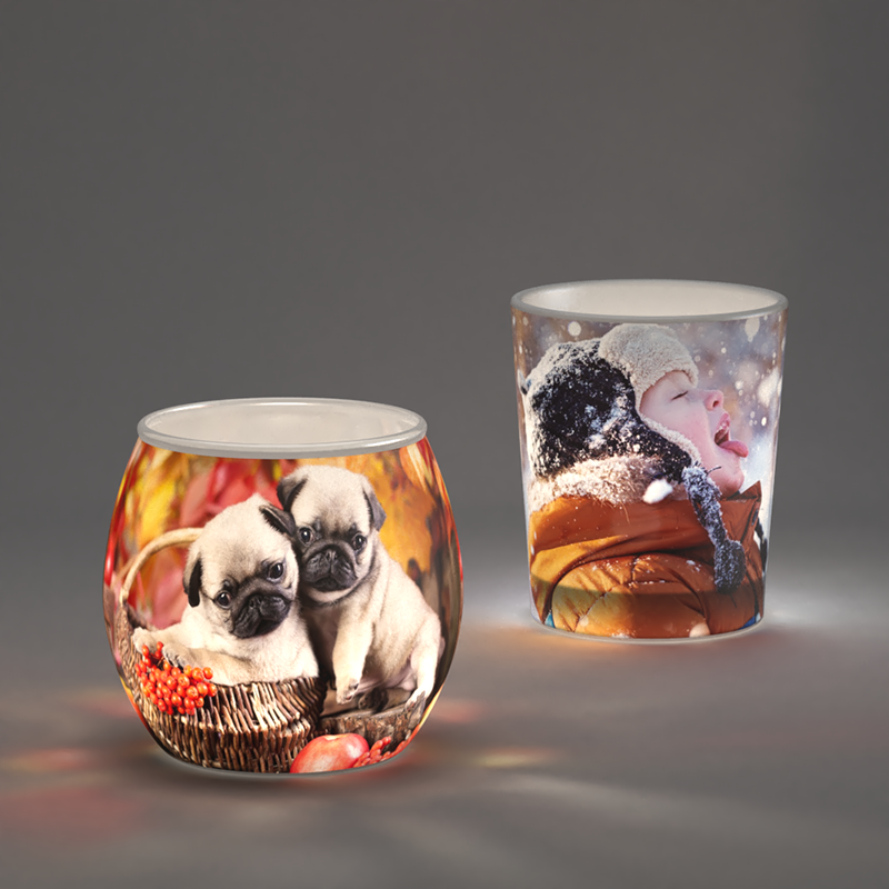 De theelichthouders zijn verkrijgbaar met een keuze uit twee finishes, die de uitstraling vna je foto's bepalen. De matglazen houder is ietwat doorschijnend, waardoor je de vlam van de kaars door het glas heen kunt zien. De kleuren van je foto komen op deze houder wat subtieler over en hebben een licht transparant effect. De kaarsenhouder met een matte, witte ondergrond is geheel dekkend, waardoor de kleuren van je ontwerp levendig overkomen. In dit geval is het licht van de kaars vooral aan de bovenkant zichtbaar. Beide opties leveren mooie resultaten op en zorgen voor een prachtige sfeer in huis - de keuze is geheel aan jou.