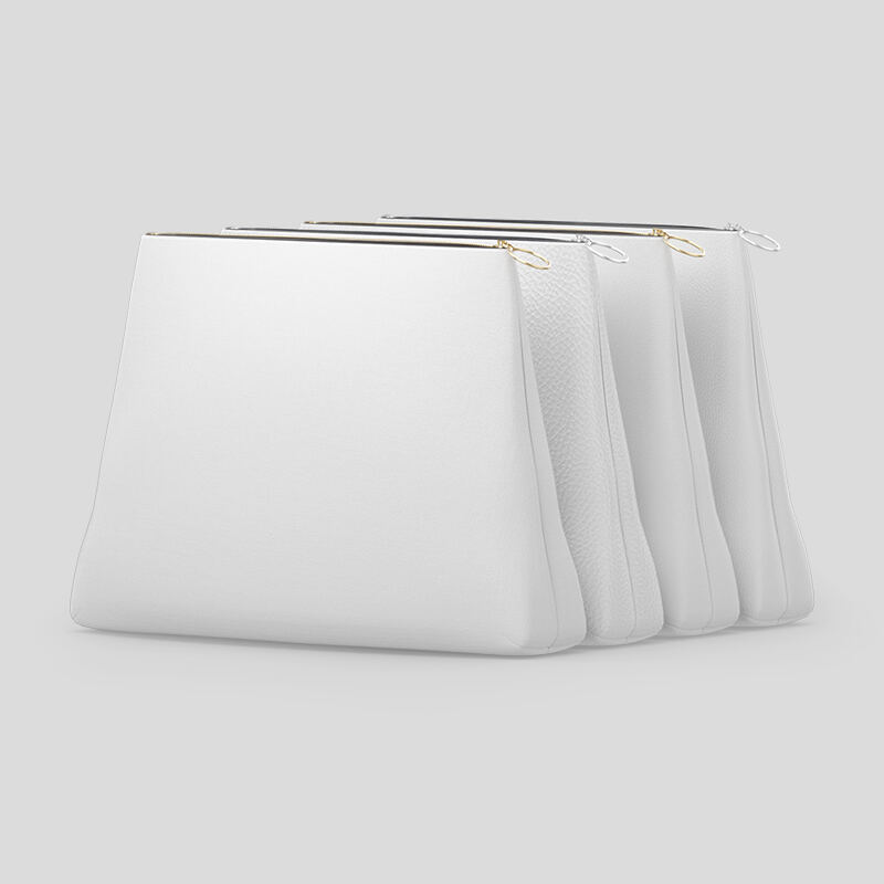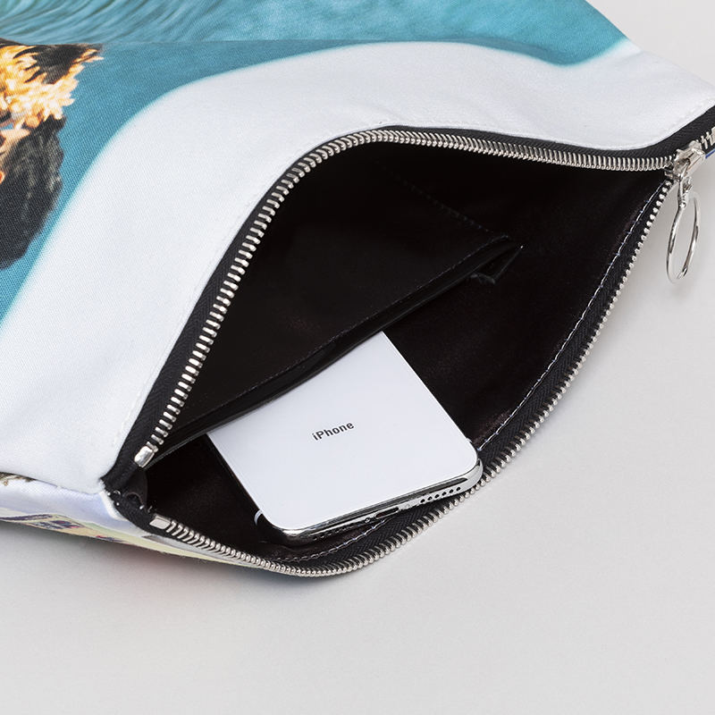 Jouw gepersonaliseerde clutch wordt bedrukt met behulp van moderne digitale printtechnieken, die zorgen dat de print tot diep in de vezels van de stof doordringt. Elk deel van de tas wordt handgemaakt op bestelling in onze studio, door ons ervaren team van printtechnici, vakmensen en naaisters - van de buitenkant en de voering tot de rits en de afwerking.