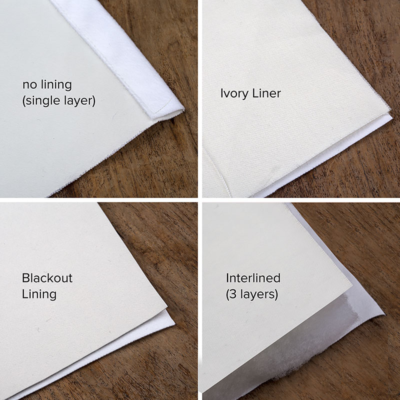 We bieden ook vier verschillende voeringopties. De gordijnen zijn gemaakt van Suede Vision textiel, waaraan u kunt kiezen uit een voering zonder voering, één laag van onze hoogwaardige ivoorkleurige voering, één laag van onze verduisterende voering (dicht geweven en crèmekleurig), of een tussenvoering. Een tussenvoering heeft drie lagen: het bedrukte Suede Vision gordijn, een hoogwaardige voering in het midden en de ivoorkleurige voering aan de achterkant. Let op: als u kiest voor een voering die geen verduisterende voering is, zullen uw gordijnen niet langer dezelfde verduisterende eigenschappen hebben.
