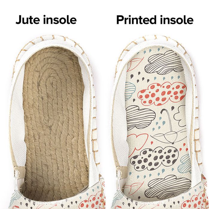 Het zachte canvas is een lichte stof die bedrukt wordt met jouw ontwerp. De espadrilles worden voorzien van een elastiek, die zich bevindt tussen de hak en het voorblad van de schoen, aan de binnenkant van de voet. Dit geeft je voeten wat bewegingsruimte en zorgt dat jij op zomerse dagen comfortabel rond kunt lopen in je unieke espadrilles. De jute is gemaakt van een natuurlijke vezel die verkregen wordt uit planten. Dit is een heerlijk, zacht en comfortabel materiaal voor de zolen van jouw espadrilles. De gepersonaliseerde binnenzool bestaat uit linnenlook stof, die jouw voeten fris en cool houdt. Wanneer jij jouw espadrilles voor de eerste keer draagt, kunnen ze wat strak aanvoelen. De stof past zich echter aan, aan de vorm van jouw voeten en binnen korte tijd zullen ze comfortabel aanvoelen.
