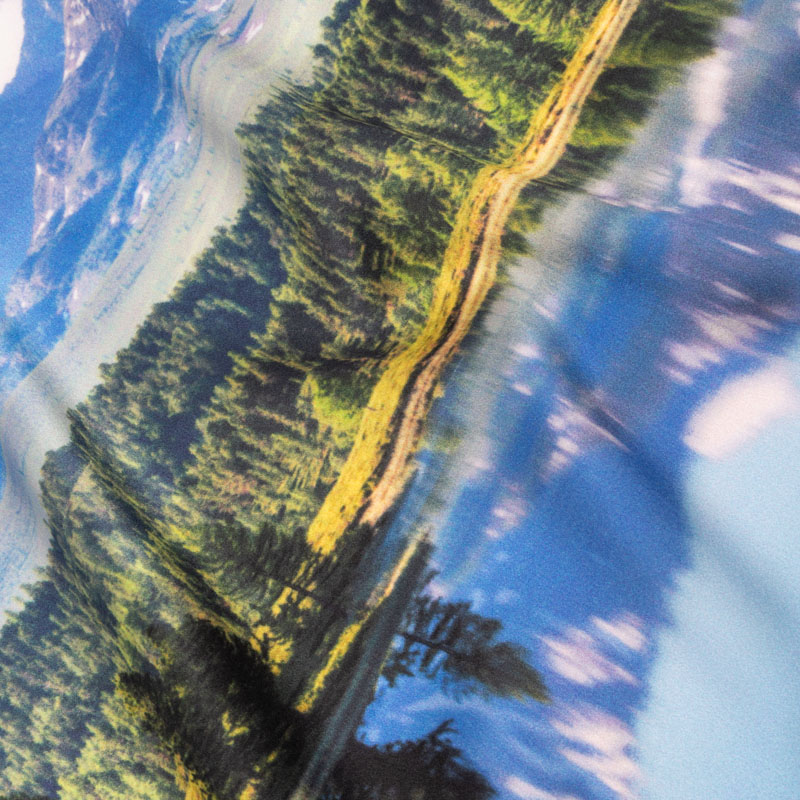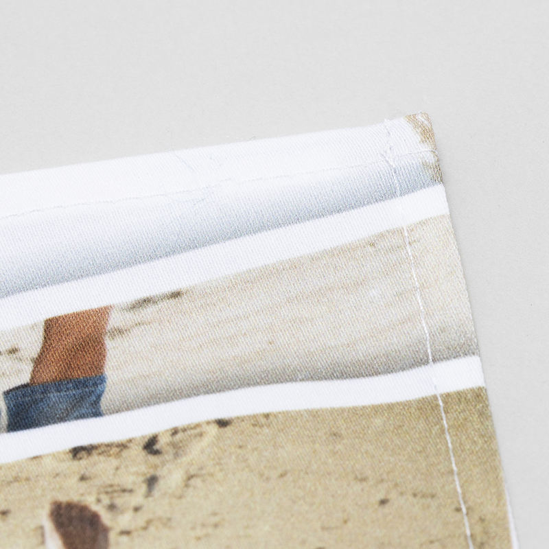 Bij het ontwerp van gepersonaliseerde servetten is het belangrijk rekening te houden met het afloopgebied. We adviseren om belangrijke kenmerken uit de buurt van de randen te houden, omdat er een klein deel van de stof gebruikt wordt voor het creëren van de zoom.