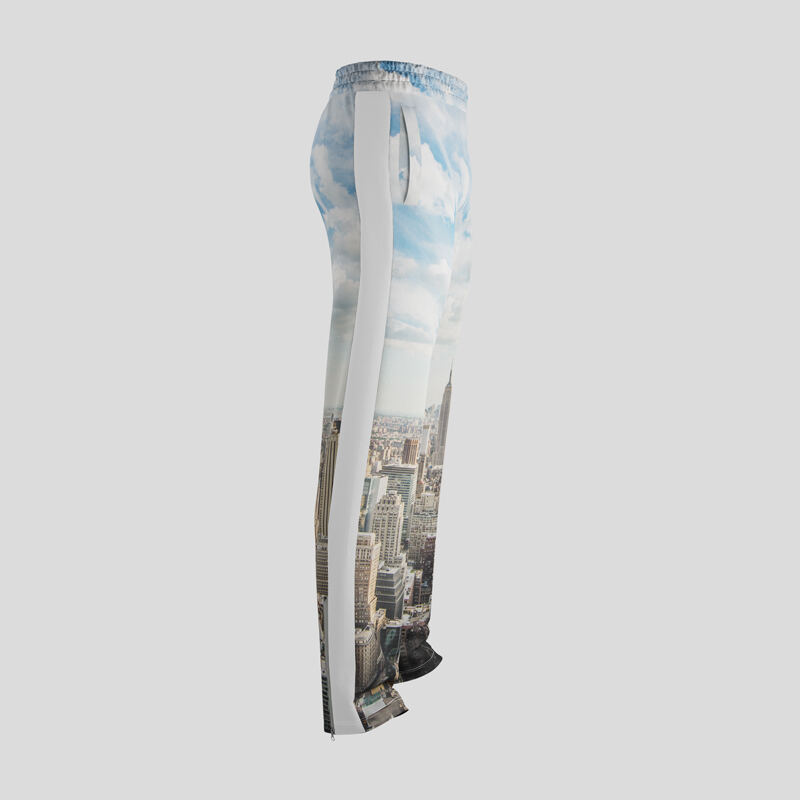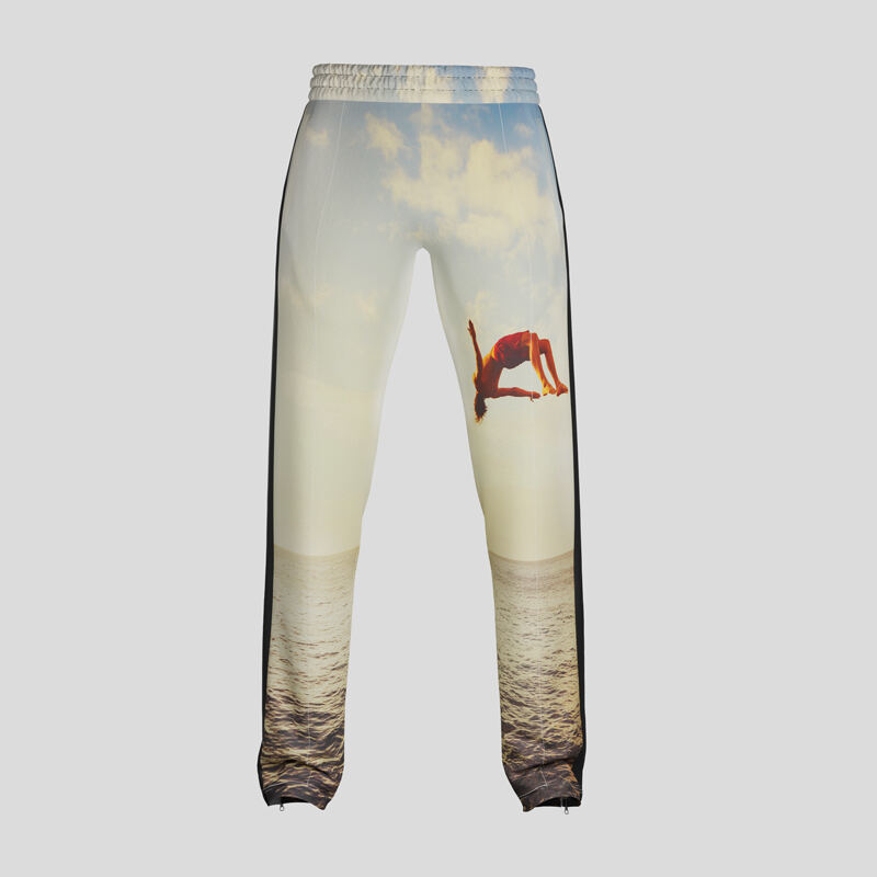 Een elastische tailleband en ritsen bij de enkels zorgen voor een comfortabele pasvorm die makkelijk aan- en uitgaat. Beide broekzakken worden mee bedrukt, waardoor je een echt bedrukt trainingspak creëert. De ritsen zijn verkrijgbaar in wit, grijs of zwart en bepalen tegelijkertijd de kleur van het stiksel. Ontwerp de voor- en achterkant van elke broekspijp én de tailleband – perfect voor een trainingspak met logo of naam. Een subtiele zoom over de voorzijde en een streep langs de zijkant geven een gestroomlijnde look.