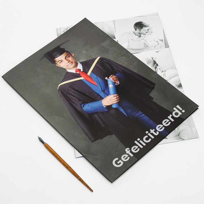 Je ontwerp wordt afgedrukt op hoogwaardig mat papier met behulp van een modern printproces dat zorgt dat de inkten tot diep in vezels van het materiaal doordringen. Dit levert een grote gepersonaliseerde kaart op met een premium kwaliteit fullcolourprint die jarenlang mooi blijft. Vervolgens knippen we de XL kaart met jouw ontwerp op maat. De binnenzijdes worden bedrukt met jouw boodschap of de door jou gekozen foto's. De kaarten worden geleverd met een 200 g/m² handgemaakte envelop.
