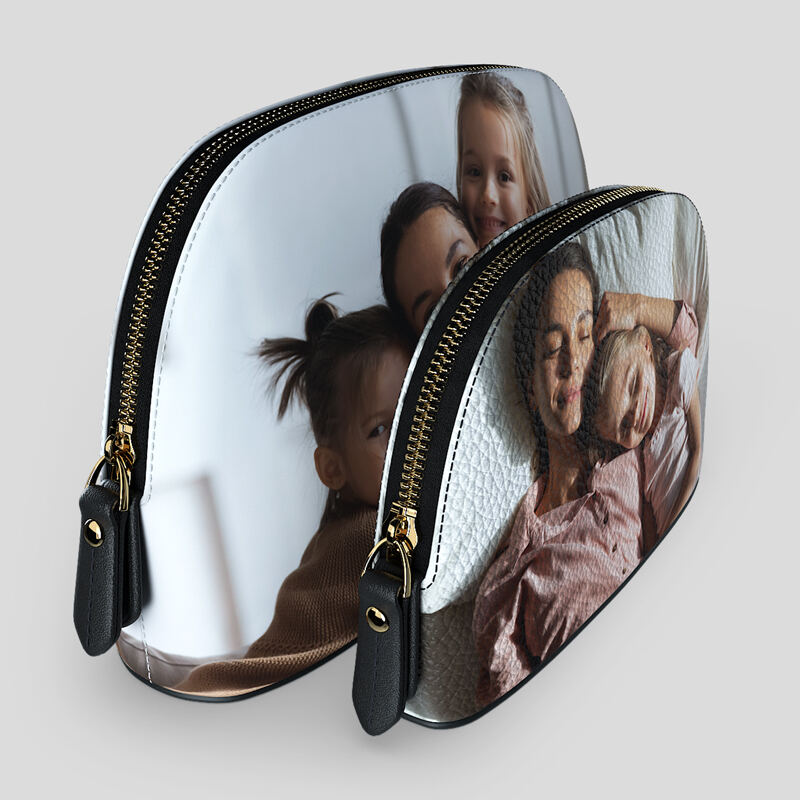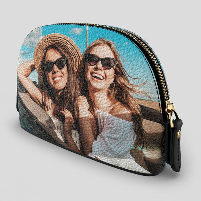 Een make up tas met naam of collage is een echte blikvanger. Plaats de belangrijkste afbeeldingen in het midden van het ontwerpvlak zodat ze niet wegvallen in de naden. Voeg initialen, tekst of een pakkende quote toe voor een toilettas met tekst die niemand anders heeft. Met onze online tool kun je jouw beauty bag personaliseren in een paar klikken, van achtergrondkleur tot lettertype. Ontwerpen met contrasterende kleuren komen prachtig uit op het leer, zowel in gladde als gebobbelde variant. Upload gerust je favoriete foto voor een make up tas eigen foto.