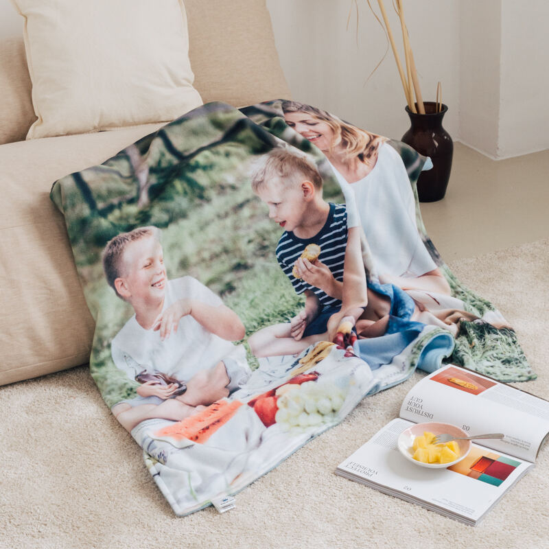 Laat ontwerpen of foto's afdrukken op een eenlaagse fleece deken – een ideale fotodeken.