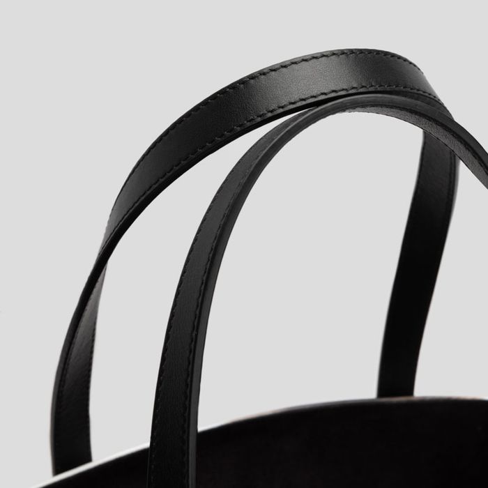 Beide tassen hebben stevige leren hengsels van 42 cm (21 cm vanaf de bovenkant van de tas) en een extra binnenvakje van 21 x 15 cm.