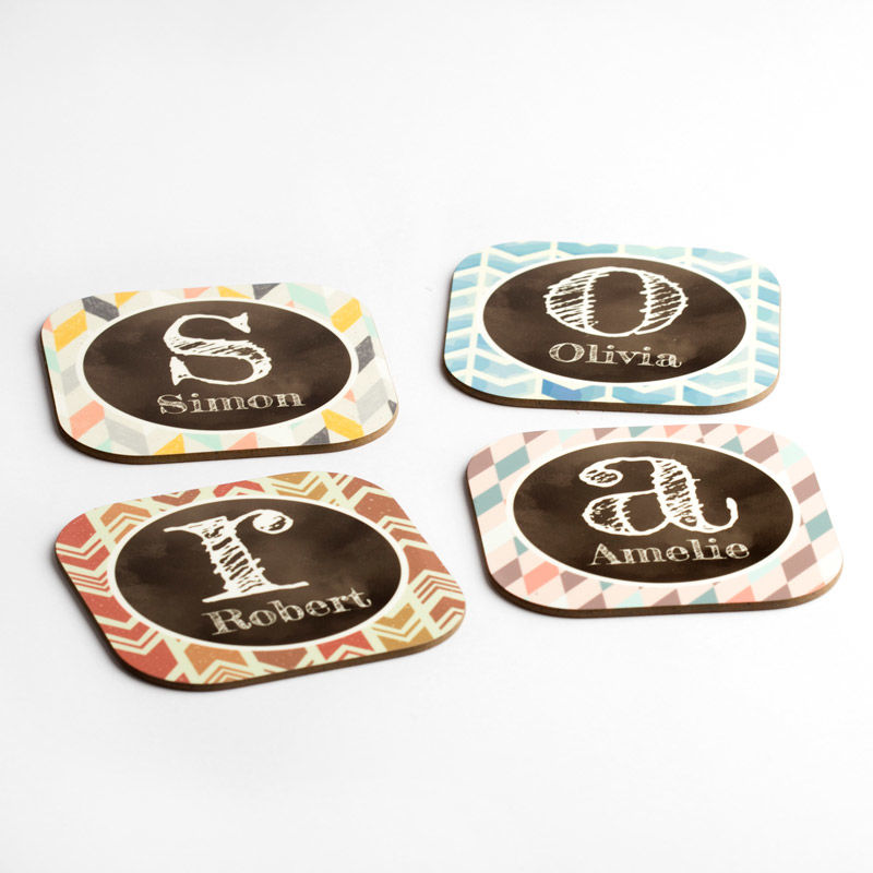 Maak een set onderzetters met naam bestellen voor het hele gezin: combineer portretten met namen zodat iedereen zijn eigen coaster herkent. Voor een bruiloft kun je de initialen van het bruidspaar en de datum toevoegen, of individuele naamkaartjes maken die gasten mee naar huis nemen.