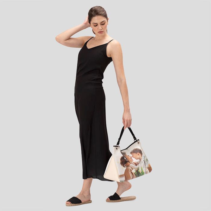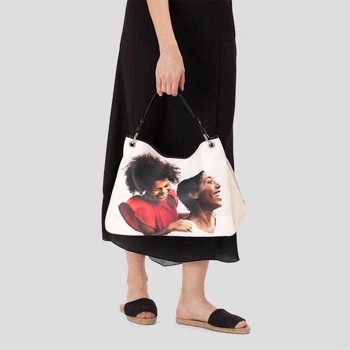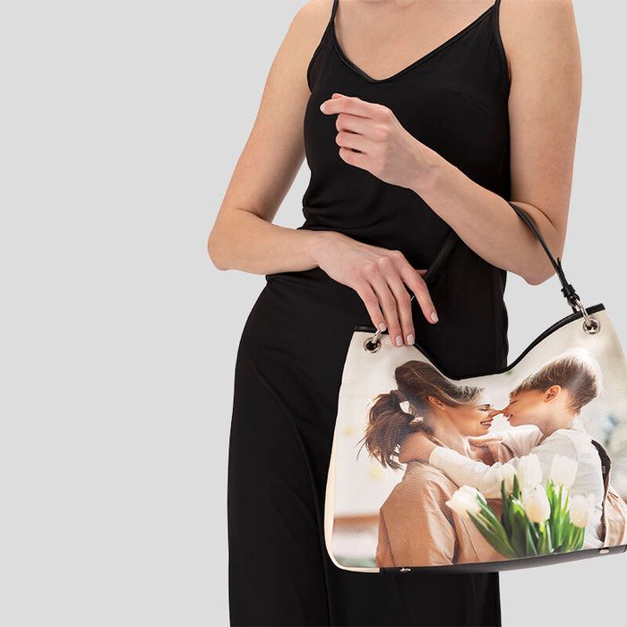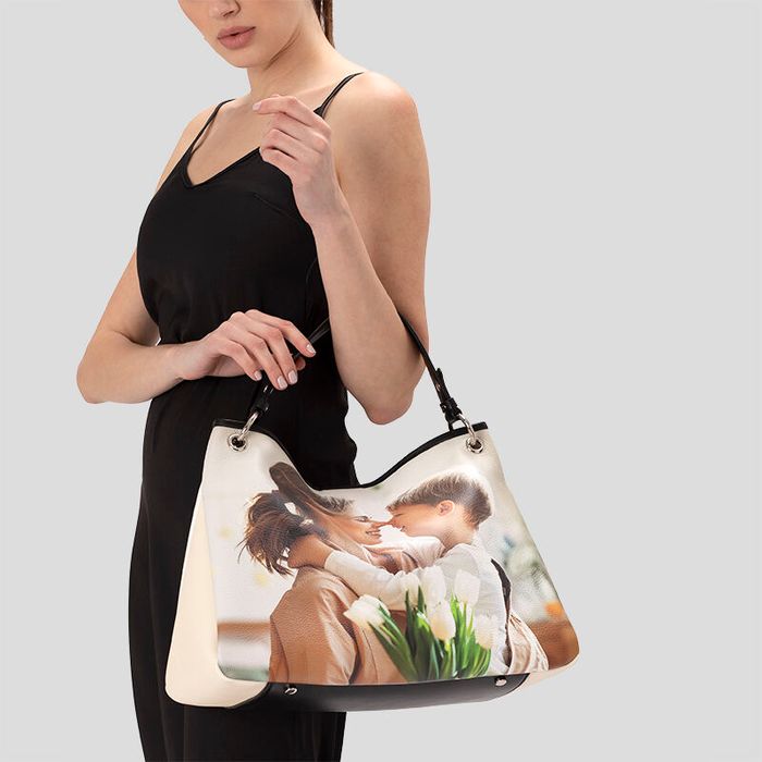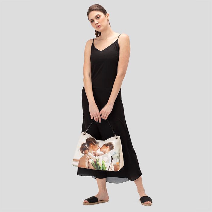 De gepersonaliseerde slouch tas wordt gemaakt van premium nappaleer in een keuze uit twee texturen: glad of gebobbeld. Alle accenten, zoals de onderkant, de bovenste randen, het hengsel en de lipjes worden gemaakt van gladde, zwarte nappa. Je foto of ontwerp wordt op heldere wijze rechtstreeks op het leer afgedrukt, waardoor een print ontstaat met levendige kleuren en scherpe details. Je kunt een bedrukte slouchy tas ontwerpen als perfecte toevoeging aan je eigen tassencollectie of als bijzonder cadeau voor een speciaal persoon in je leven.