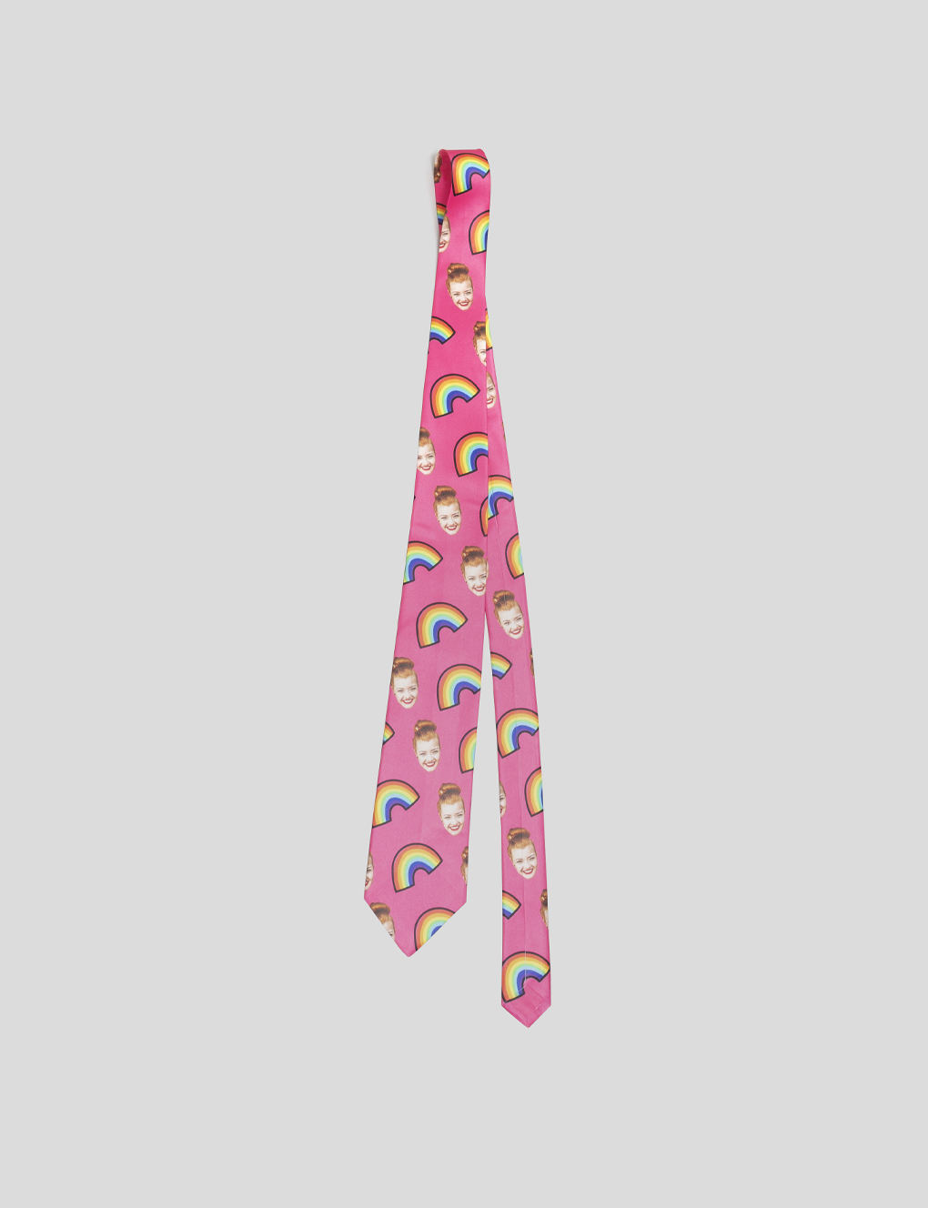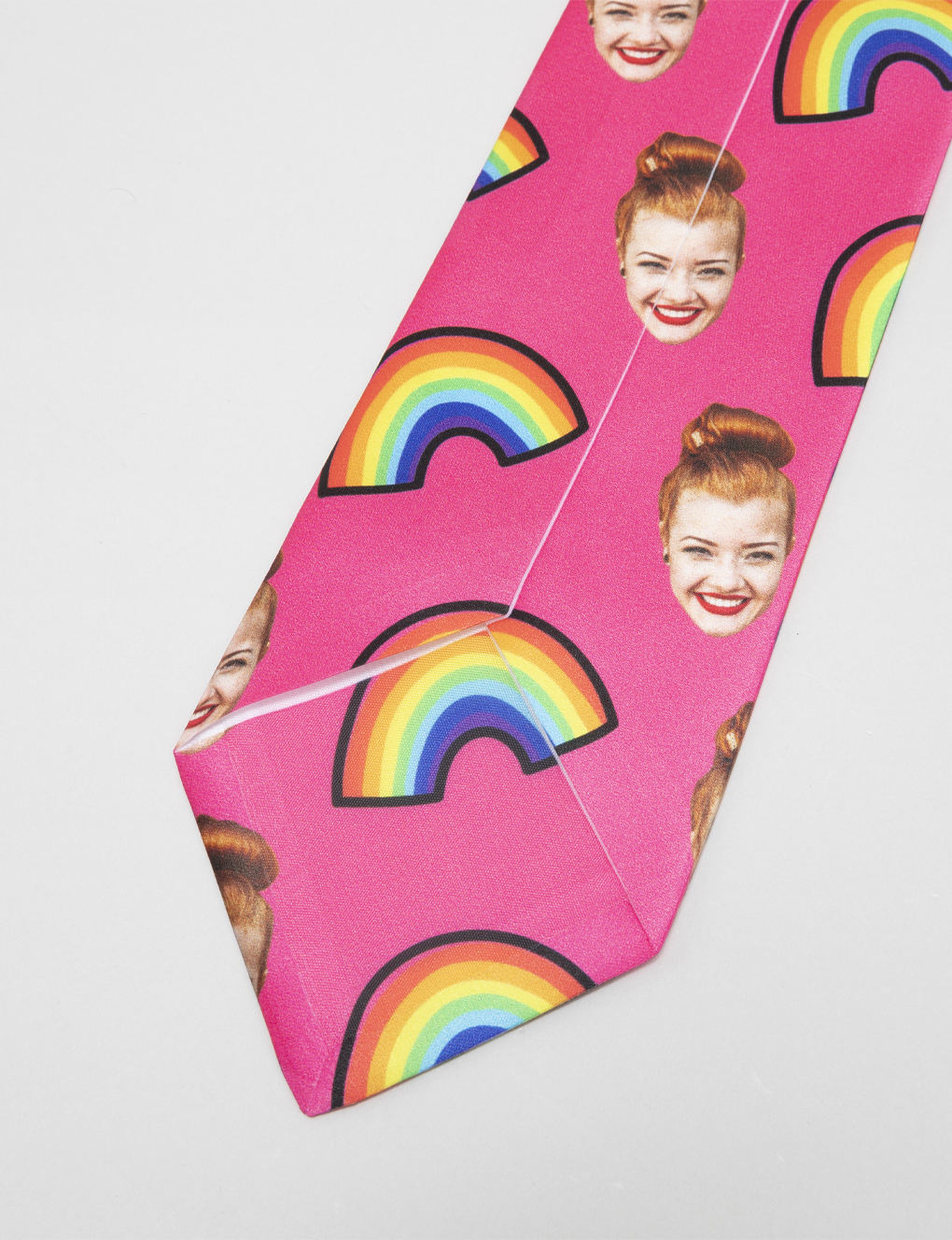 Met je gezichtsstrikje, jij bent op de stropdas, en de stropdas is op jou, wie is op de stropdas, enzovoort. De enige manier om dat te verslaan is om een selfie van jou in de stropdas te gebruiken, om op de stropdas te printen. Plaats je foto in de ontwerpinterface en je kunt in een mum van tijd je eigen stropdas met gezicht erop maken. Je gezichtsstrikje heeft geen lus om de staart van je aangepaste stropdas doorheen te schuiven, het is zelftippend.