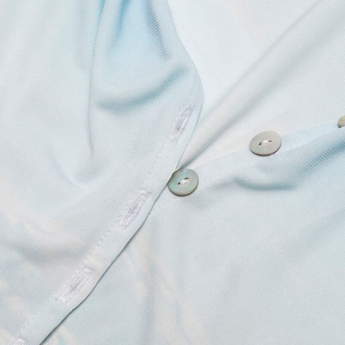 Je design wordt met milieuvriendelijke inkten diep in de vezels van de jersey gesublimeerd. Deze techniek zorgt voor een levendige, duurzame print die niet vervaagt. Daarna wordt elk patroononderdeel in ons atelier precies uitgesneden en met de door jou gekozen draad en knopen tot een elegante doorknoopjurk gestikt. Alles gebeurt op bestelling voor minimale afval en snelle levering.