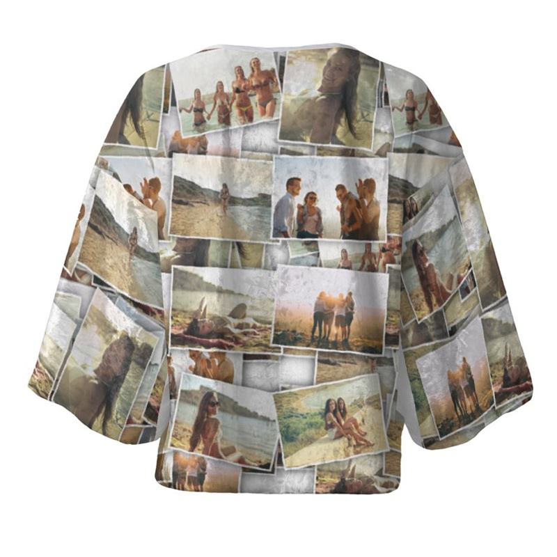 Bij het ontwerpen van jouw eigen kimonojas, kun je meerdere afbeeldingen uploaden om een fotocollage te maken. Gebruik foto's met gelijkwaardige tinten, om een collage te creëren die mooi een geheel vormt. Dit ziet er prachtig uit, afgedrukt op dit oversized kimonojack. Ook vakantiefoto's of afbeeldingen van de natuur zullen er prachtig uitzien op de fluweelachtige stof.