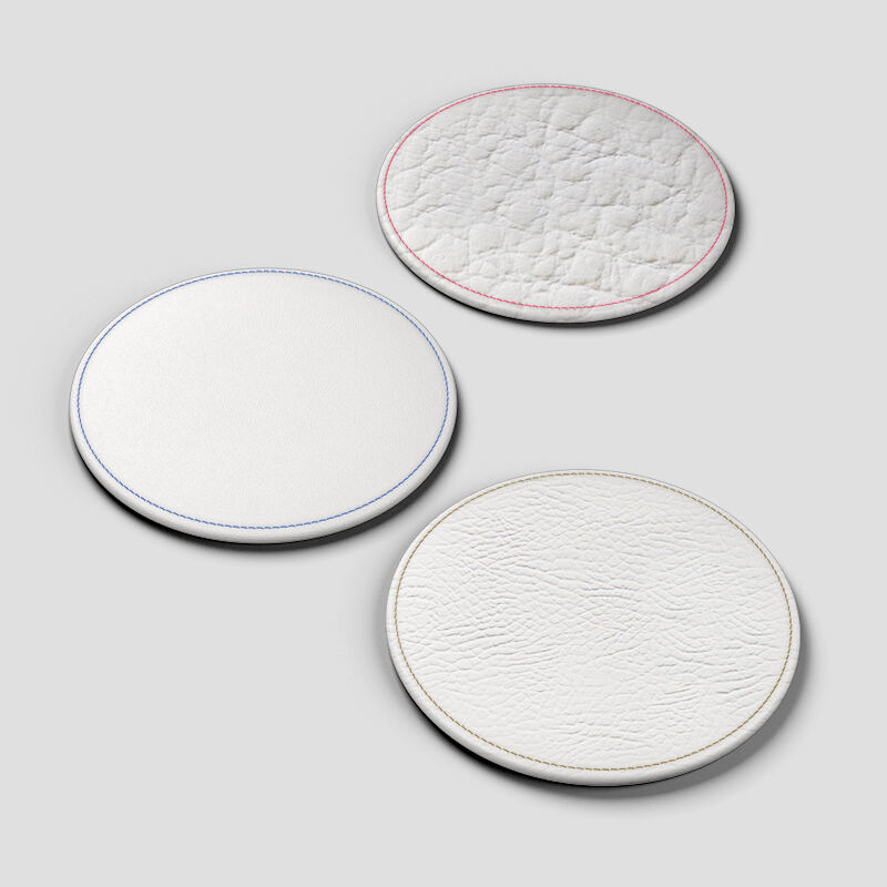 We bieden twee vormen: een ronde variant of een vierkant model met afgeronde hoeken. Beide hebben een elegante dikte van 0,4 cm en worden afgewerkt met jouw keuze uit vijf stikselkleuren: houtskool, crème, bruin, rood of blauw.