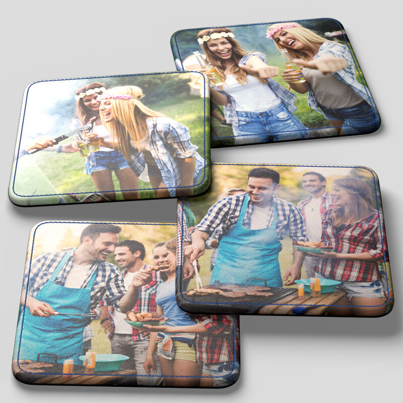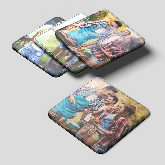 Verzamel de mooiste familiefoto's, een quote of jouw bedrijfslogo en laat ons de lederen onderzetters bedrukken. Groepsfoto's komen schitterend uit op de vierkante coasters, terwijl een strak logo perfect past op het ronde model.