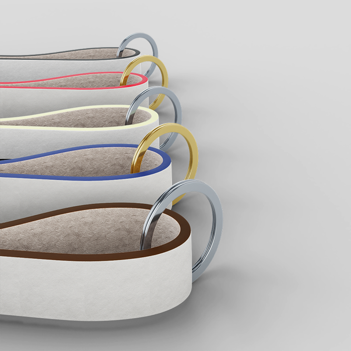 Van de leren band wordt vervolgens een lus gemaakt, waaraan de goud- of zilverkleurige metalen details worden bevestigd. Elke leren sleutelhanger met naam wordt voorzien van een gepolijste sleutelring aan een kant en een clip aan de andere kant.