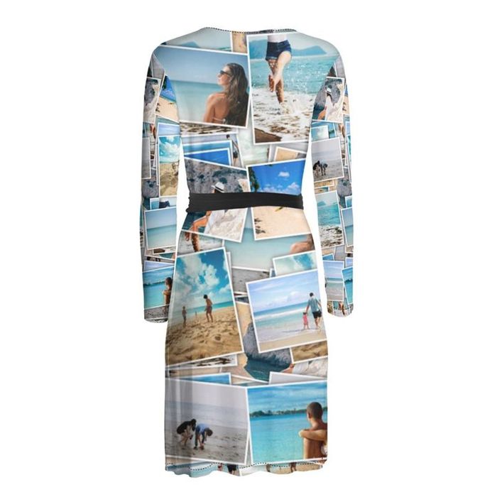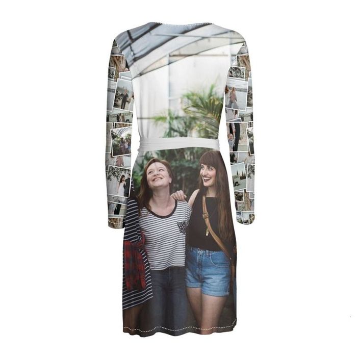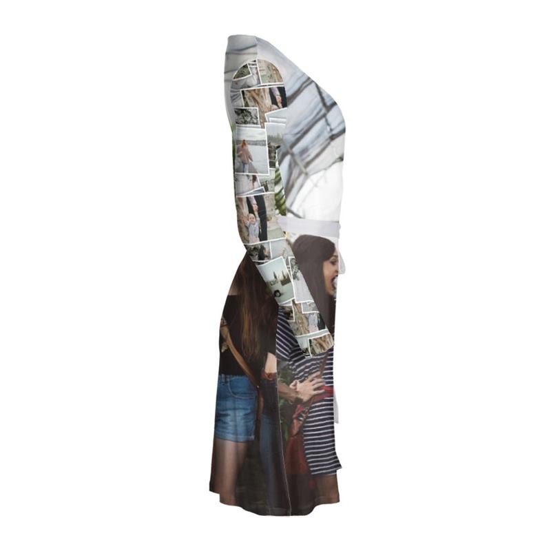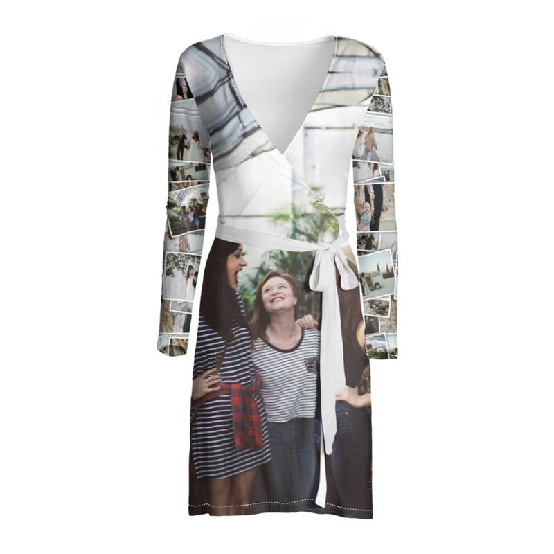 Deze prachtige wikkeljurk accentueert de vrouwelijke vormen en wordt op bestelling gepersonaliseerd met jouw foto's.