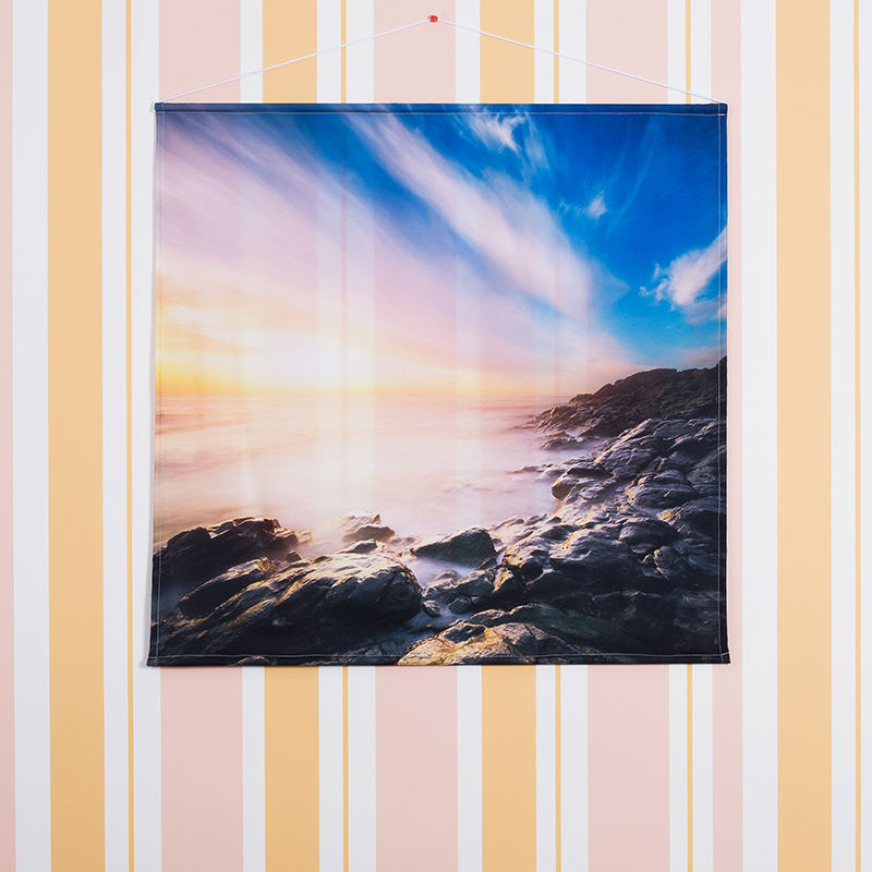 De gepersonaliseerde muurhangers worden gemaakt door ons team van getalenteerde textielexperts. Door het specialistische drukproces dat we gebruiken zullen je foto's niet vervagen, ze blijven generaties lang mooi. We knippen de stof op de gewenste maat en naaien handmatig de 8 mm metalen stangen in het doek, om een prachtig en uniek wandkleed voor jou te creëren.