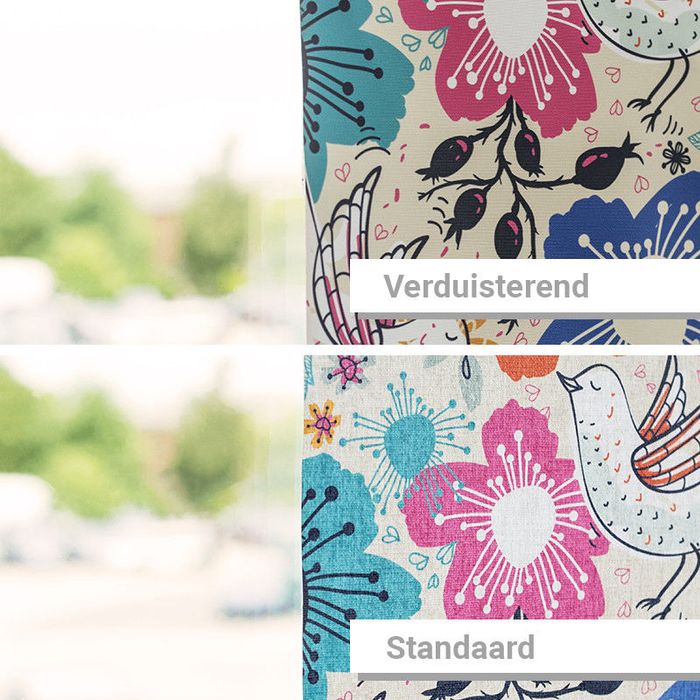 Onze gepersonaliseerde rolgordijnen zijn verkrijgbaar in 2 soorten stof, die allebei een andere uitstraling en doel hebben. Onze Stevige Doorschijnende stof laat wat licht door, maar je kunt er niet doorheen kijken, perfect als je niet in het donker wilt zitten maar toch wat zonlicht tegen wil houden. Houd er rekening mee dat lichte kleuren in je ontwerp meer licht doorlaten dan andere kleuren. Onze Verduisterende stof doet wat de naam zegt, hij houdt al het licht buiten, perfect voor kinderkamers, slaapkamers en zelfs filmkamers. Het materiaal is waterdicht, dus het kan zelfs in de badkamer en keuken worden gebruikt.
