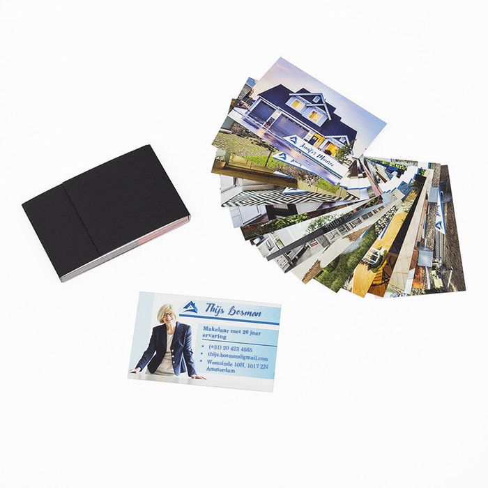 Elke set van 20 kaarten wordt geprint met de modernste digitale techniek. Het dikke papier met satijnglans geeft jouw ontwerpen een hoogwaardige, professionele look. Dankzij het handige boekje met magnetische sluiting neem je de kaarten veilig mee en scheur je ze eenvoudig uit wanneer je nieuwe contacten legt. Je kunt ervoor kiezen om alle kaarten identiek te maken of om per kaart een ander design te tonen. Zo zet je in één keer een compleet mini-portfolio neer.